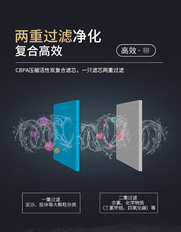 CBPA壓縮活性炭復(fù)合濾芯,也就是將傳統(tǒng)的PP棉+活性炭兩重濾芯整合在一起,能隔絕掉泥沙、膠體等大顆粒雜質(zhì)。