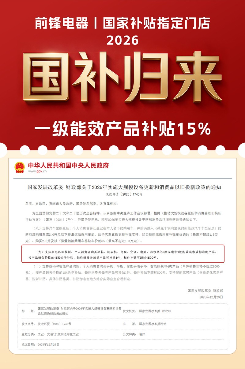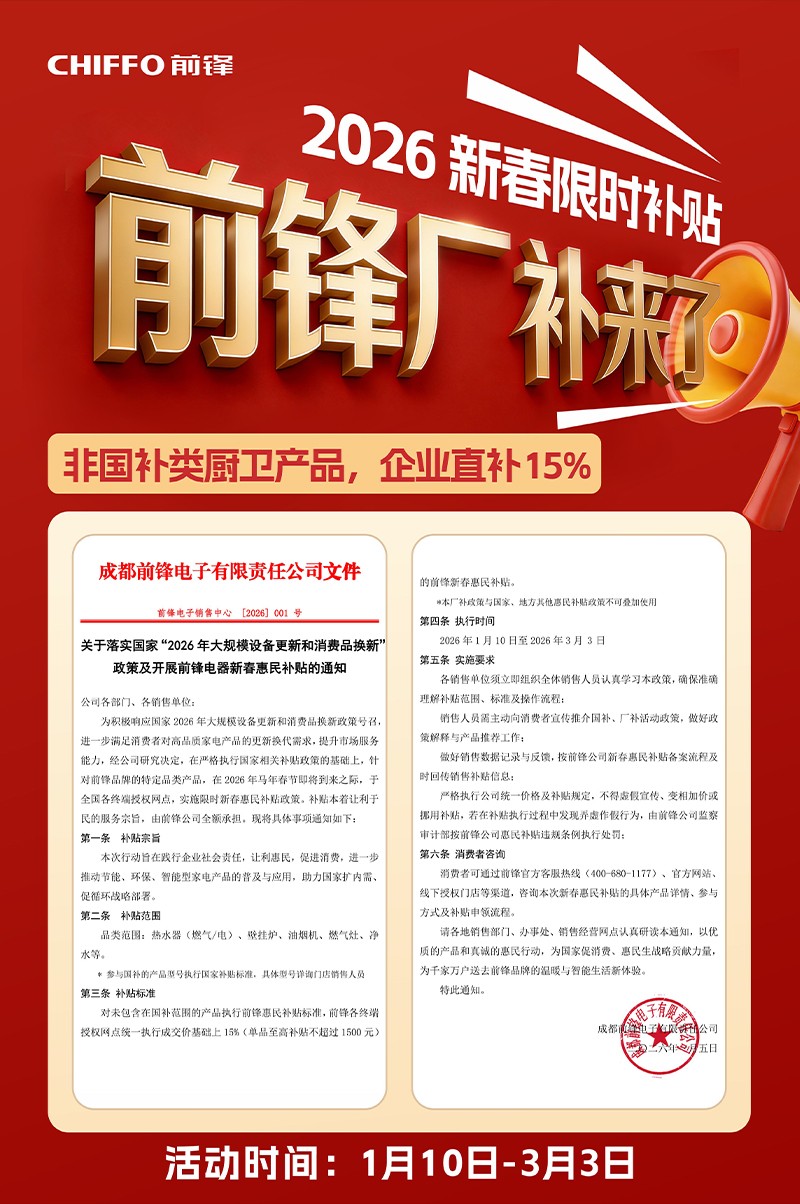新年煥新,溫暖升級(jí),2026年國(guó)補(bǔ)政策榮耀回歸!前鋒再次入選國(guó)家指定補(bǔ)貼單位,為您的品質(zhì)生活助力!更重磅的是,前鋒推出“新春廠補(bǔ)”,誠(chéng)意拉滿,補(bǔ)貼不打折、不套路,雙線補(bǔ)貼,15%直降,讓您一次購(gòu)齊,暖意全開(kāi)!