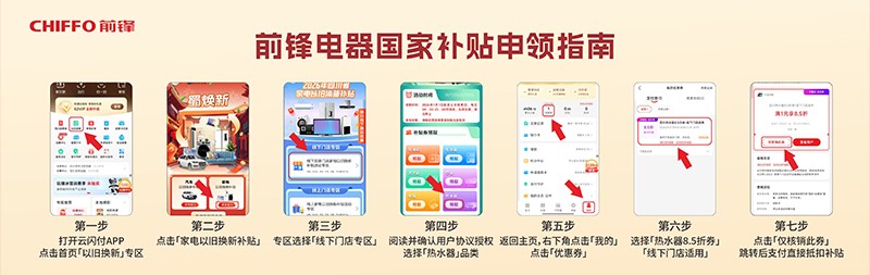 前鋒作為您身邊“國(guó)家認(rèn)證”的補(bǔ)貼放心站,購(gòu)買一級(jí)能效熱水器,可享15%國(guó)家直補(bǔ),流程超簡(jiǎn)單: